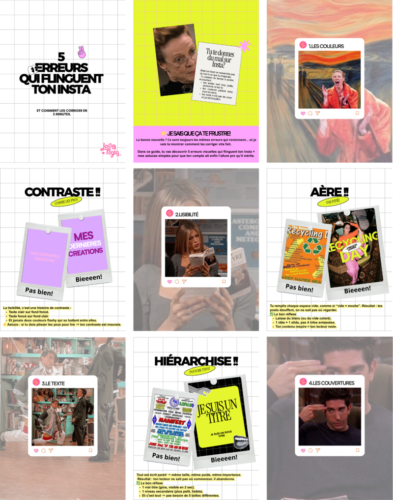 Tu passes des heures à poster mais ton feed ne décolle pas ? Ton Insta a l’air brouillon? Tu n’attires pas l’œil et encore moins des clients ? Télécharge ce guide gratuit et découvre les 5 erreurs visuelles qui sabotent ton feed (et surtout comment les éviter).